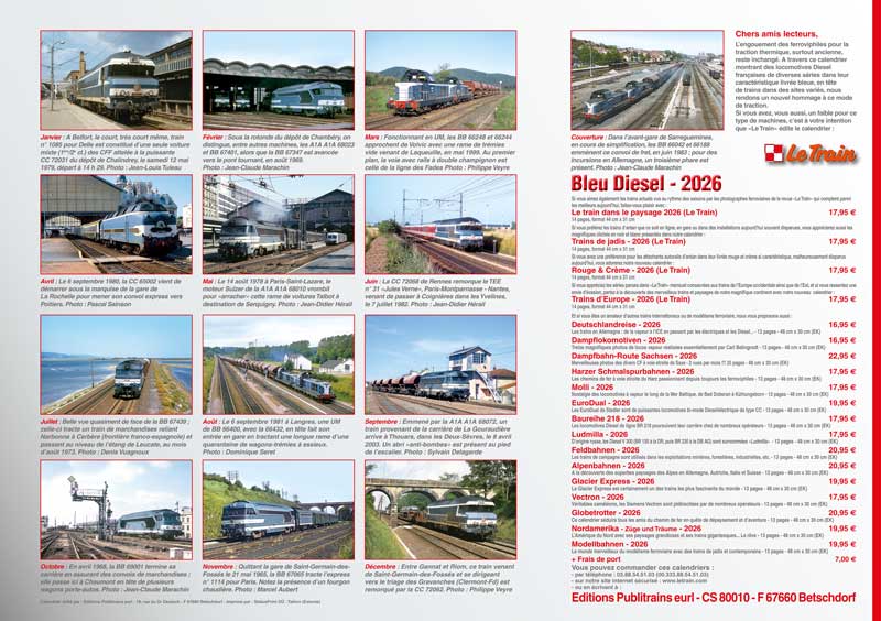 L’engouement des ferroviphiles pour la traction thermique, surtout ancienne, reste inchangé. A travers ce calendrier montrant des locomotives Diesel françaises dans leur caractéristique livrée bleue, en tête de trains dans divers sites,nous rendons un nouvel hommage à ce mode de traction...