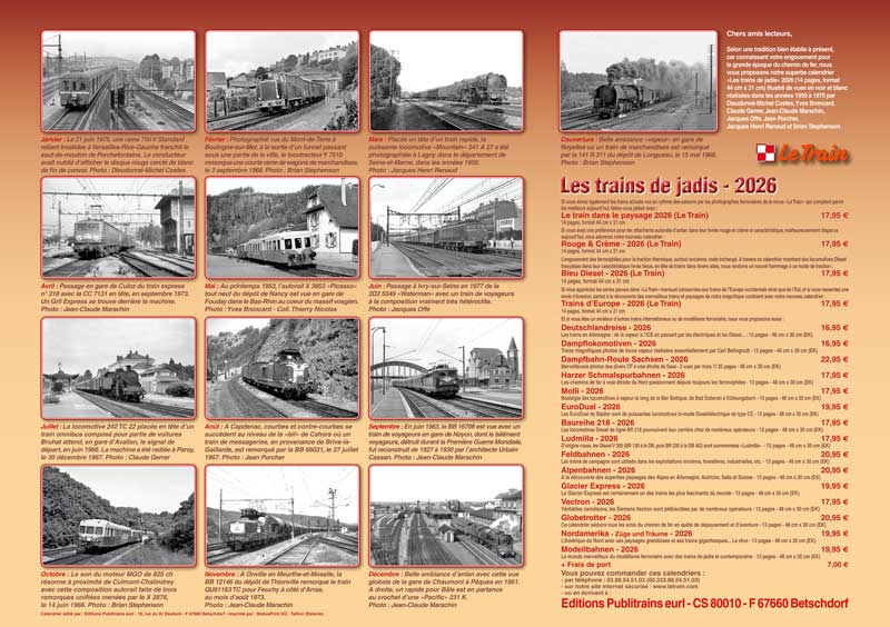 Aux amateurs de la grande époque du chemin de fer, «Le Train» propose ce calendrier illustré de photos noir et blanc présentant des trains et, parfois, des installations aujourd’hui disparus mais qui sont toujours chers à beaucoup d’entre nous et qui font même rêver les plus jeunes qui ne les ont pas connus.